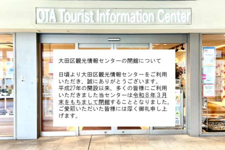 日頃より、大田区観光情報センターをご利用いただき、誠にありがとうございます。 平成27年の開設以来、大田区観光の拠点として多くの皆様にご利用いただきました当センターは、令和8年3月末をもちまして閉館することとなりました。ご愛顧いただいた皆様には厚く御礼申し上げます。 -